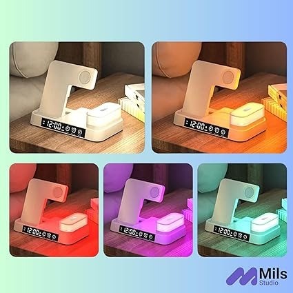A37 — многофункциональная беспроводная зарядная станция 4-в-1, которая сочетает в себе зарядное устройство, подставку для смартфона, цифровые часы с будильником и LED-ночник. Устройство позволяет одновременно заряжать смартфон, умные часы и беспроводные наушники, а также использовать встроенную подсветку.