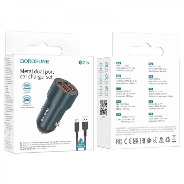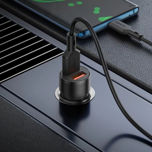 Borofone BZ19 — стильная и компактная автомобильная зарядка, выполненная в прочном корпусе, аккуратно вписывающемся в гнездо прикуривателя. Минималистичный чёрный дизайн с глянцевыми элементами выглядит аккуратно и не занимает много места. Размер и форма позволяют удобно использовать её в любом автомобиле.