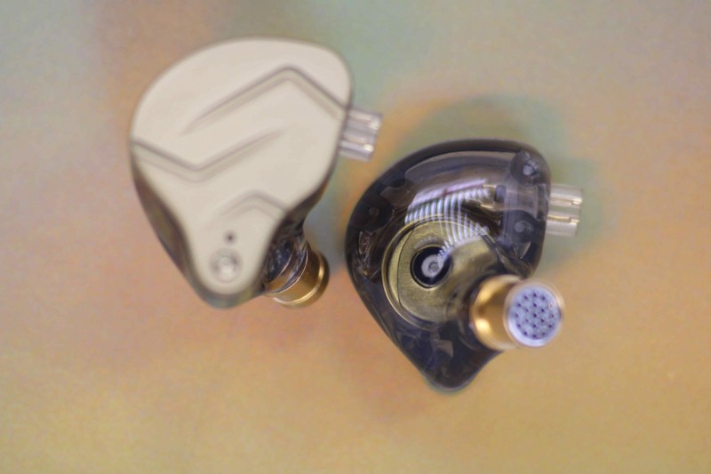 Наушники выполнены в стильном корпусе с металлической лицевой панелью и прозрачной задней частью, через которую видна внутренняя конструкция. Эргономичная форма обеспечивает удобную посадку и надёжную фиксацию в ушах. Кабель съёмный, с заушным креплением, что повышает комфорт и надёжность при использовании.